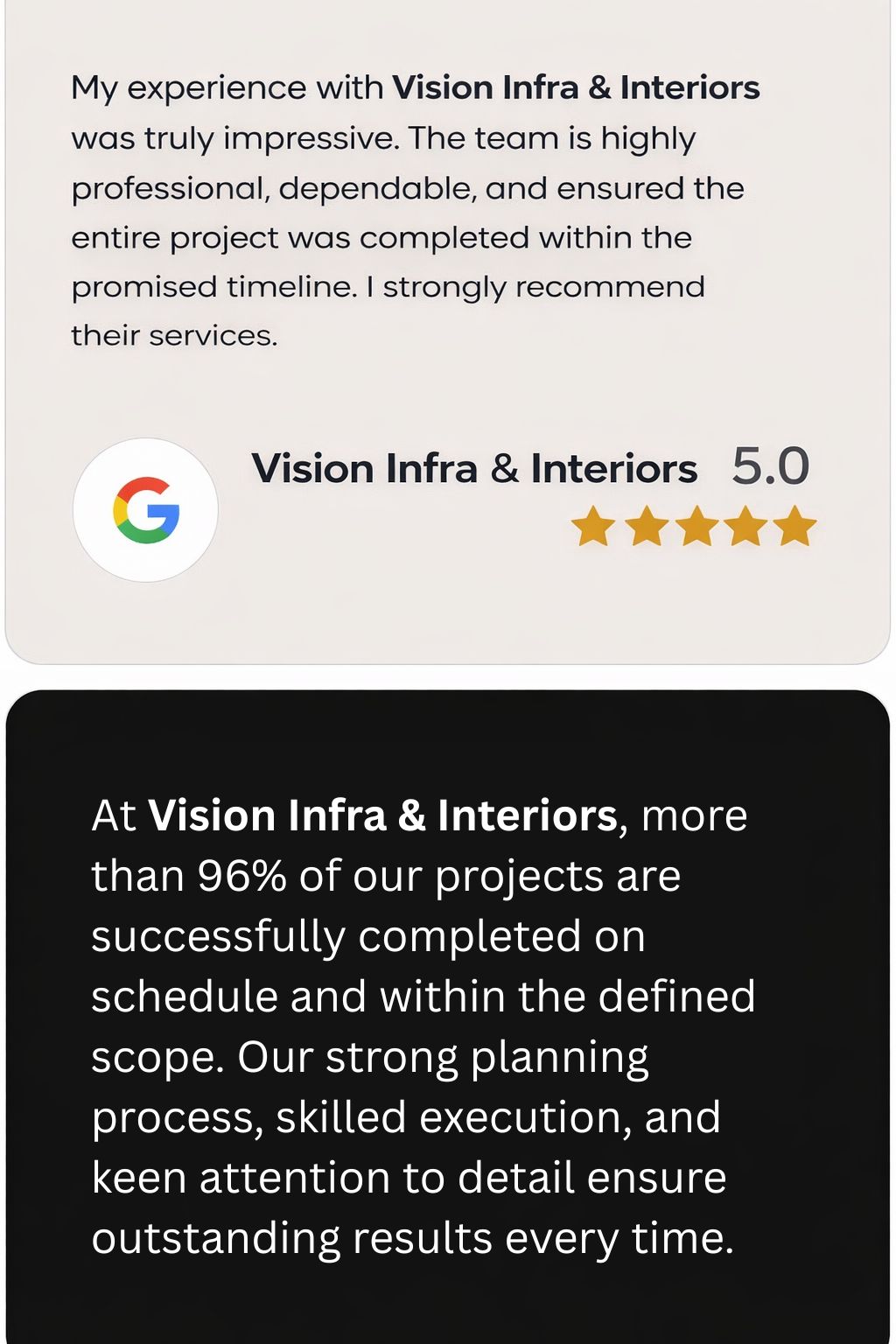 At Vision Infra & Interiors, we don’t believe in copy-paste designs. Every workspace we create is thoughtfully designed to match your team’s culture, workflow, and business goals. Our customized turnkey office interior solutions ensure your workspace is unique, practical, and built specifically for your organization.